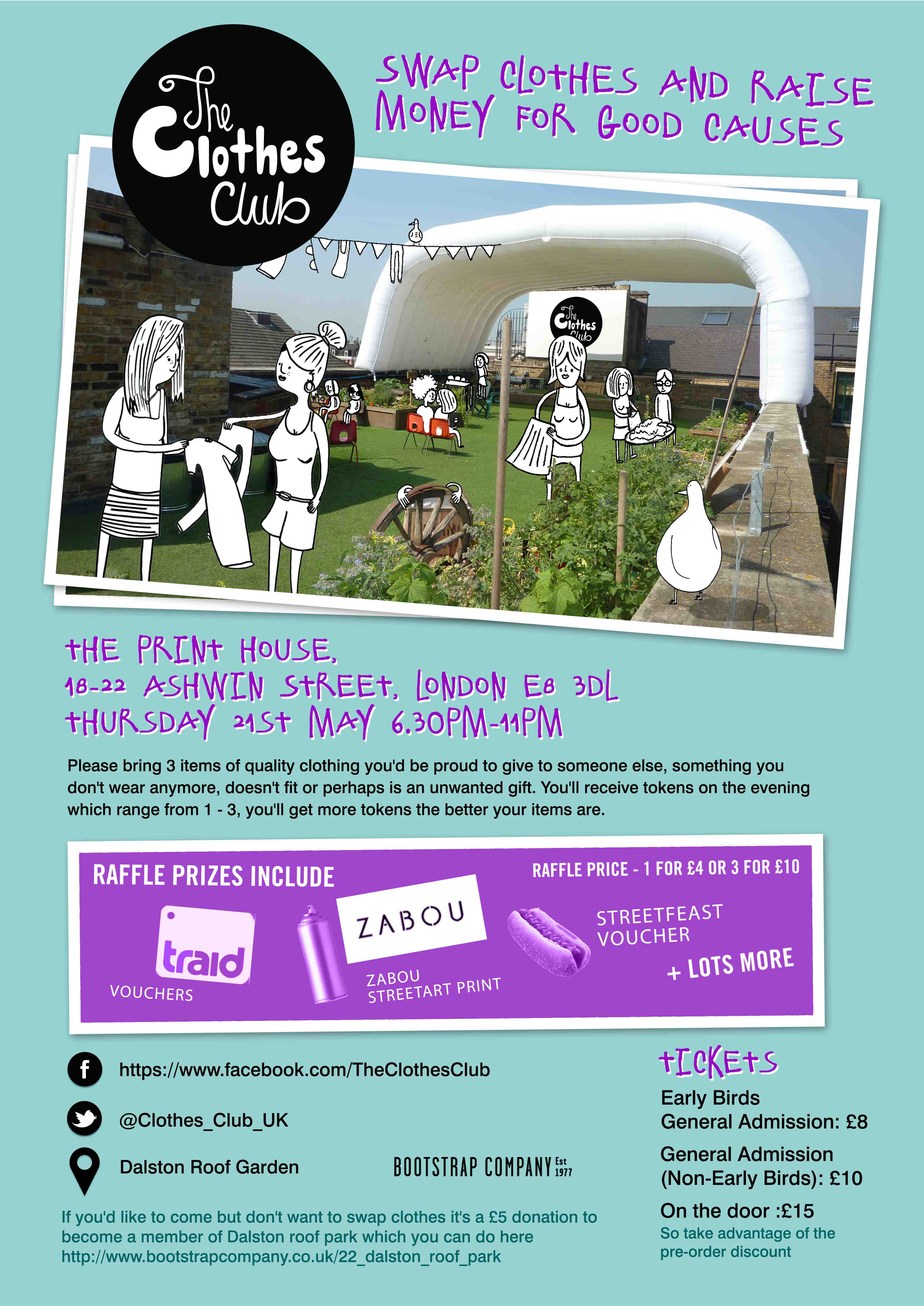 We’re excited to be doing our 2nd Clothes Club fundraising event on Dalston roof park, on Thursday 21st May during their opening launch month.We’re supporting two great projects: